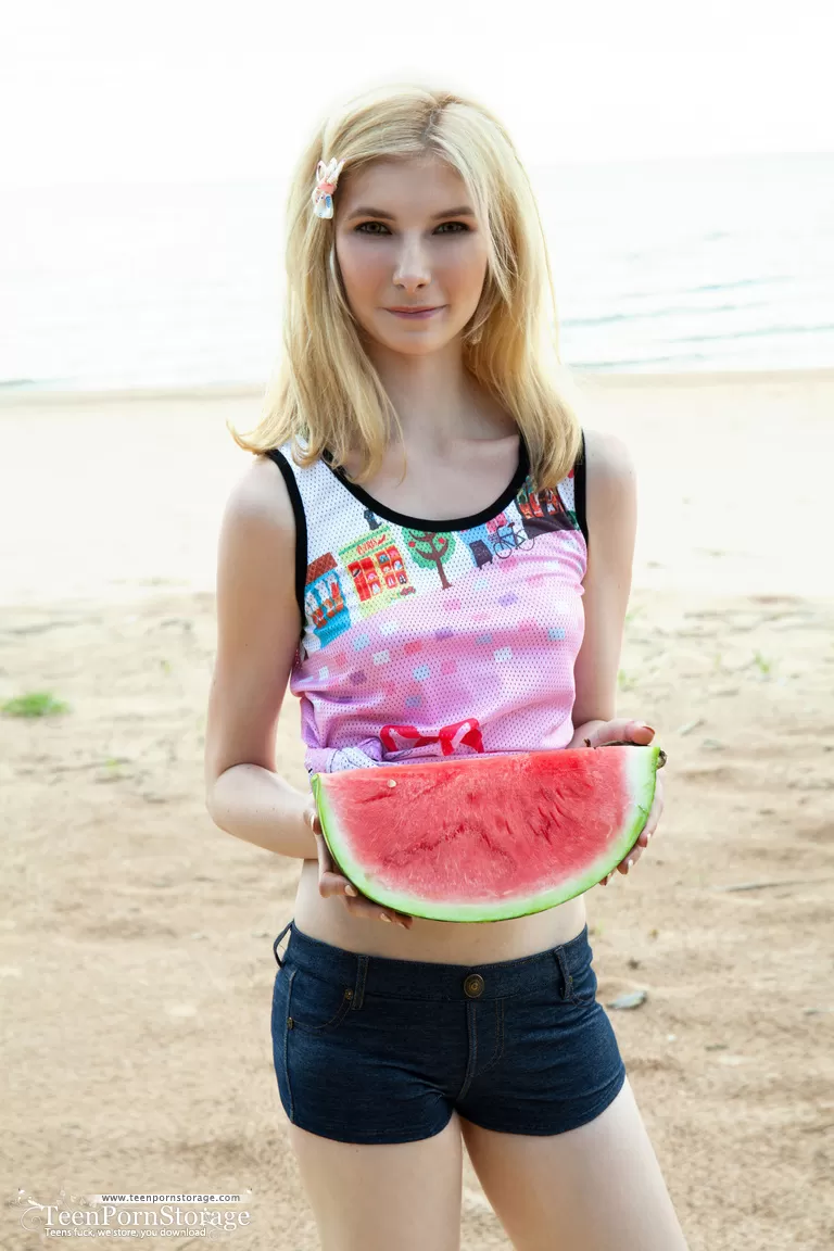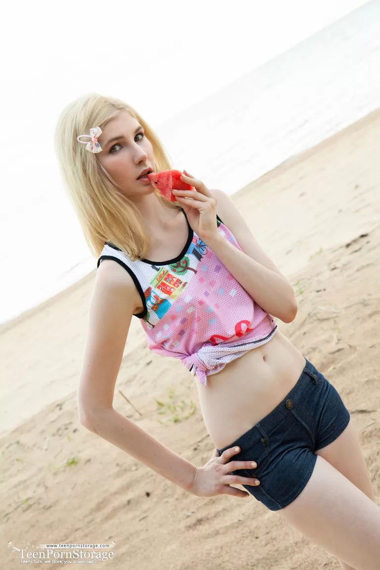 - ⚠ Описание: Блондинка снимает джинсовые шортики и белые трусики, прежде чем показать свою волосатую пизду на пляже.